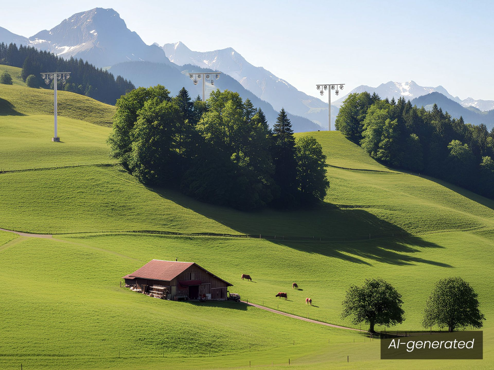 Die kompakte VentoStream-Turbine fügt sich diskret in die Landschaft ein. Minimale Anforderungen an Zufahrtstrassen und Installationsplätze. Sie kann auch per Helikopter transportiert werden.